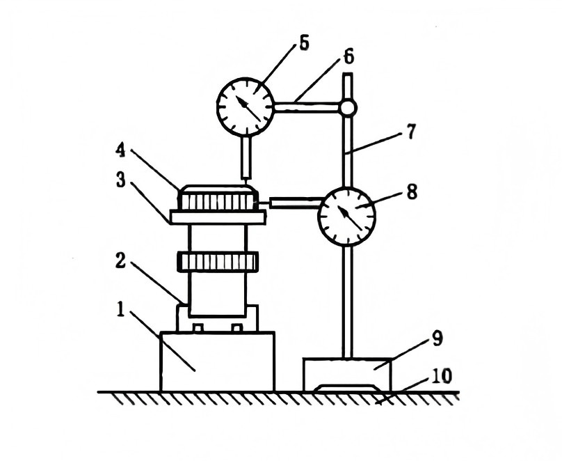 4.1.3將彈體安裝到平臺(tái)的卡盤上,卡緊。套上試驗(yàn)環(huán),再將連接環(huán)裝到彈體上,擰4~5。調(diào)整磁性表摩和橫桿的位置,使兩個(gè)千分表(5)和(8)分別與連接環(huán)頂部和側(cè)面平滑部分剛好4.1.4接觸。