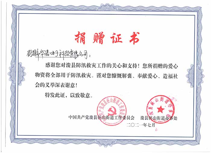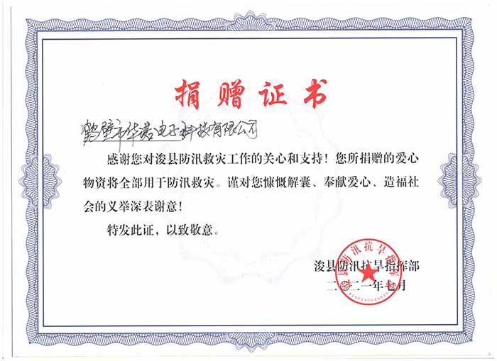 ▲浚縣防汛抗旱指揮部為鶴壁華諾代表頒發(fā)愛心《捐贈證書》